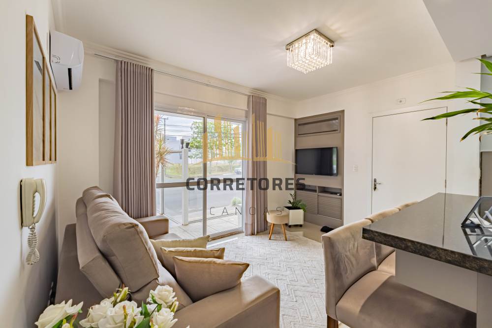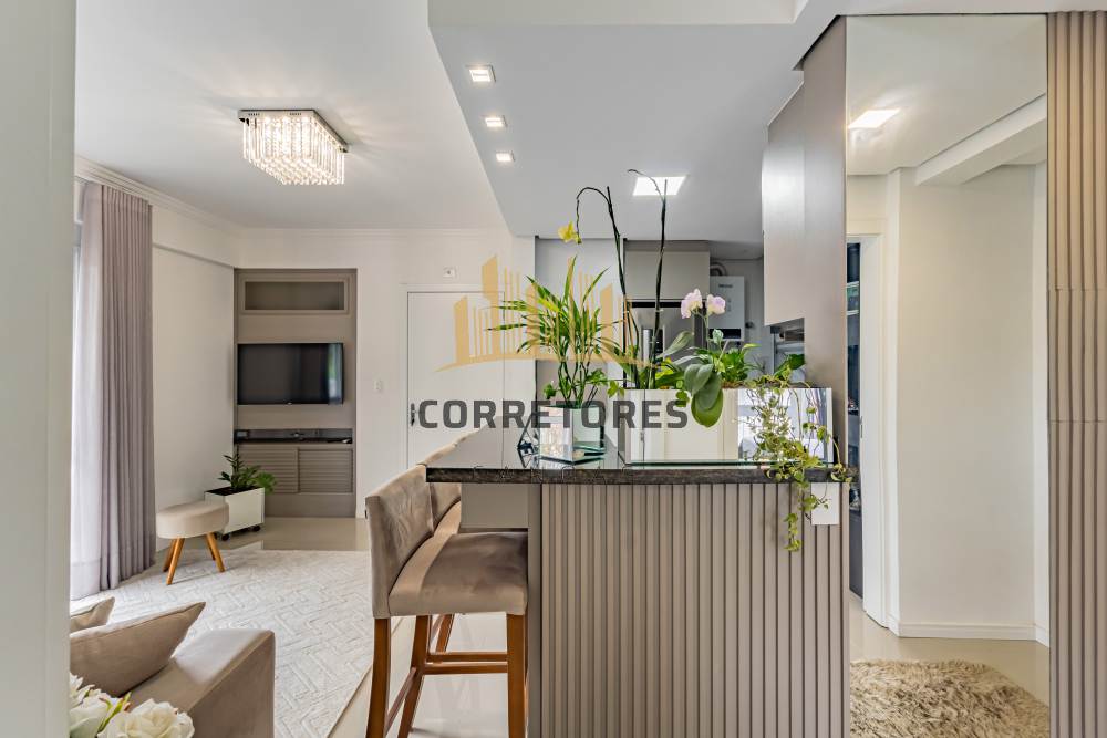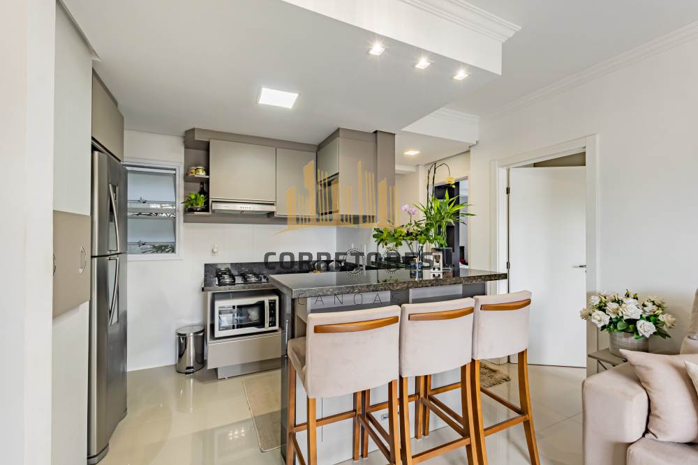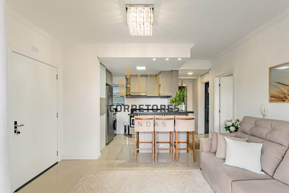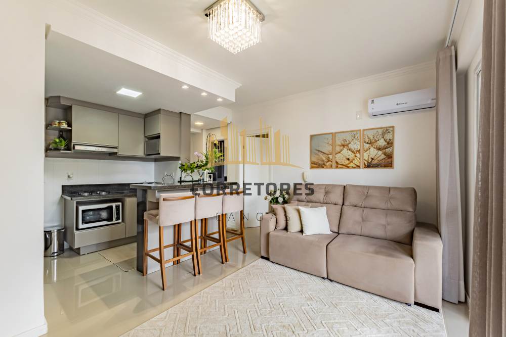 Com 50,05 m² de área privativa, o imóvel apresenta dois dormitórios, sala de estar e cozinha integradas, sendo esta no estilo americano, com bancada em mármore e churrasqueira. Conta com um banheiro, móveis planejados em todos os ambientes, piso em porcelanato, esquadrias em alumínio branco, sistema de água quente e três aparelhos de ar-condicionado tipo split (um na sala e dois nos dormitórios).