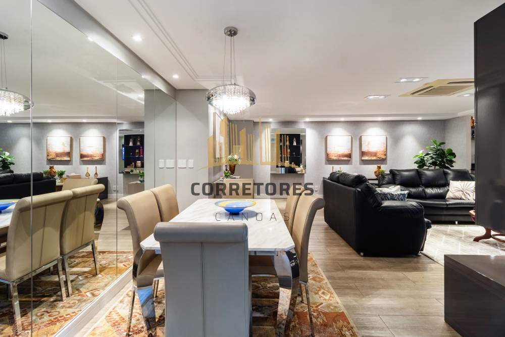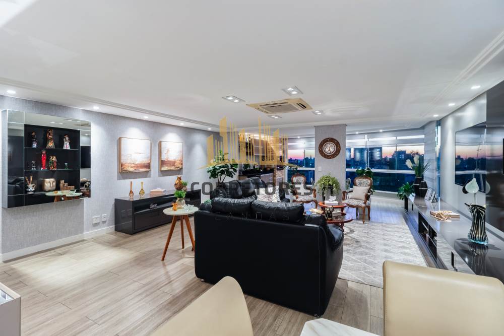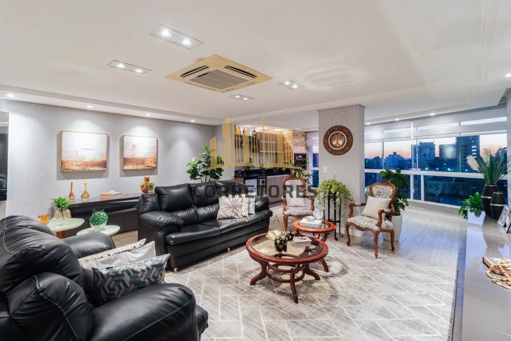 Ambiente climatizado com ar-condicionado central na sala e iluminação 100% LED. Living amplo para três ambientes, integrado à sacada gourmet com churrasqueira giratória em inox, vinheira Cuisinart, frigobar e uma vista linda da cidade.