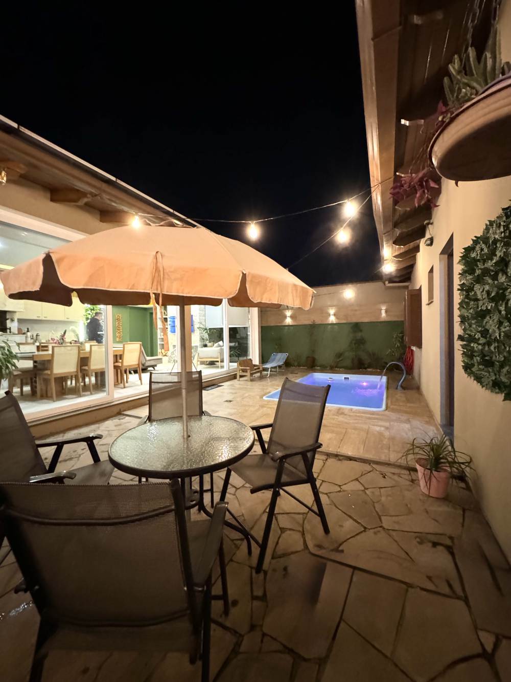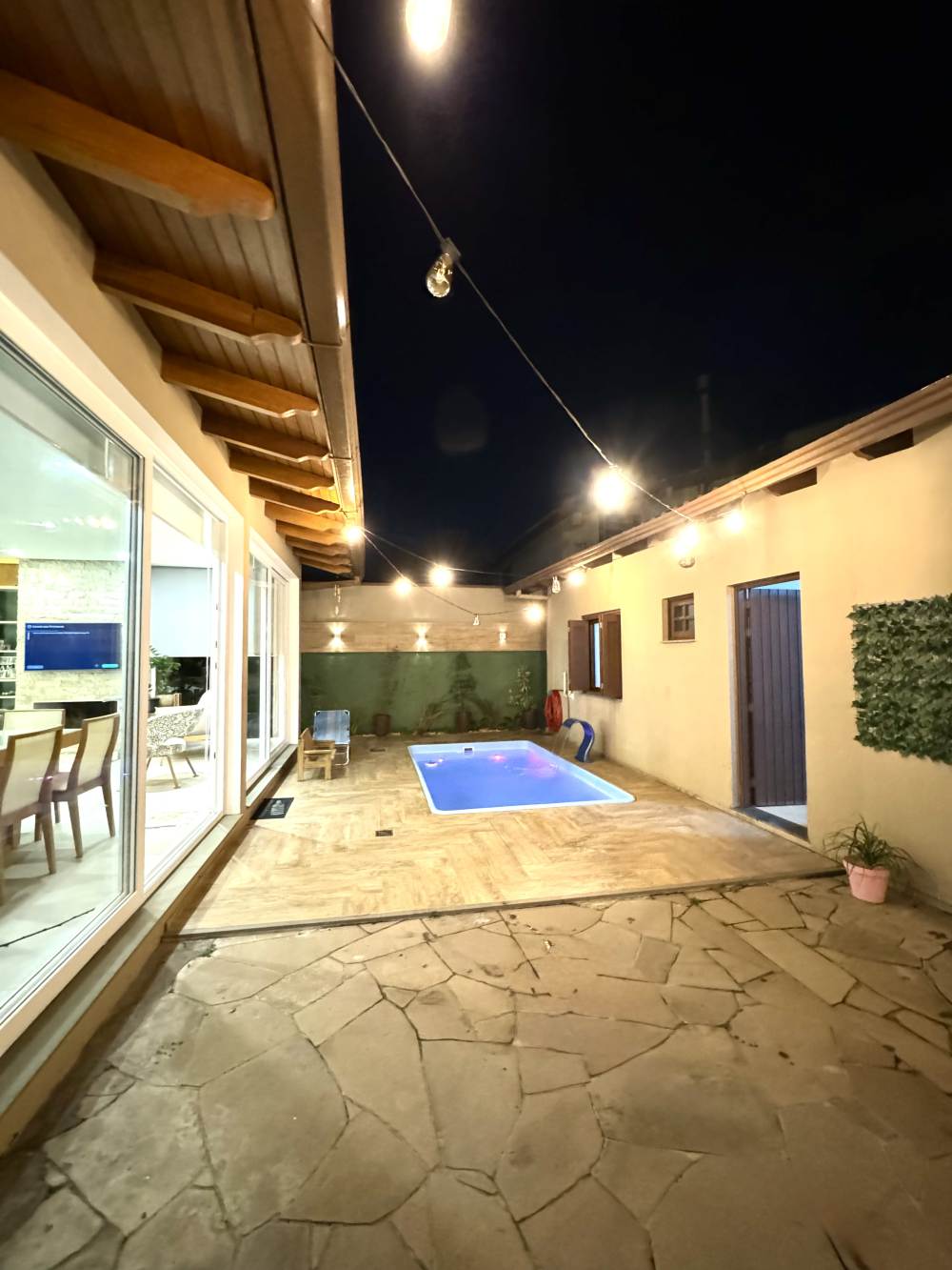 Pátio amplo com piscina, cascata e iluminação, além de pergolado coberto em vidro.