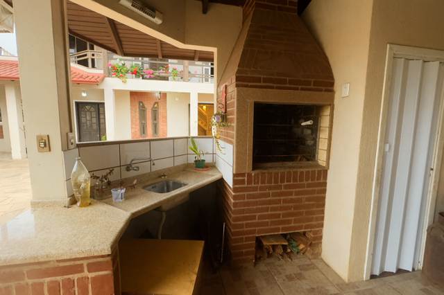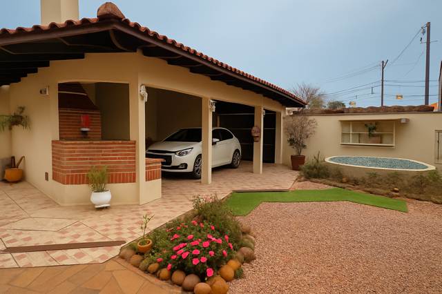 Pátio com quiosque com churrasqueira e vaga de garagem, piscina com cascata e aquecimento solar e jardim...