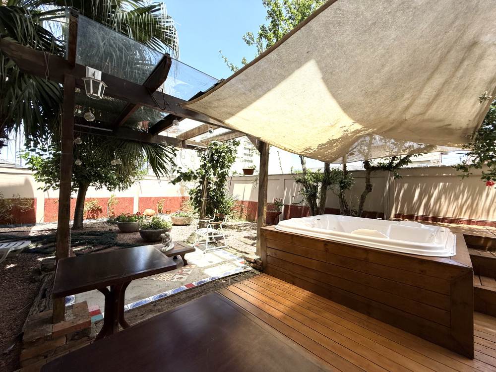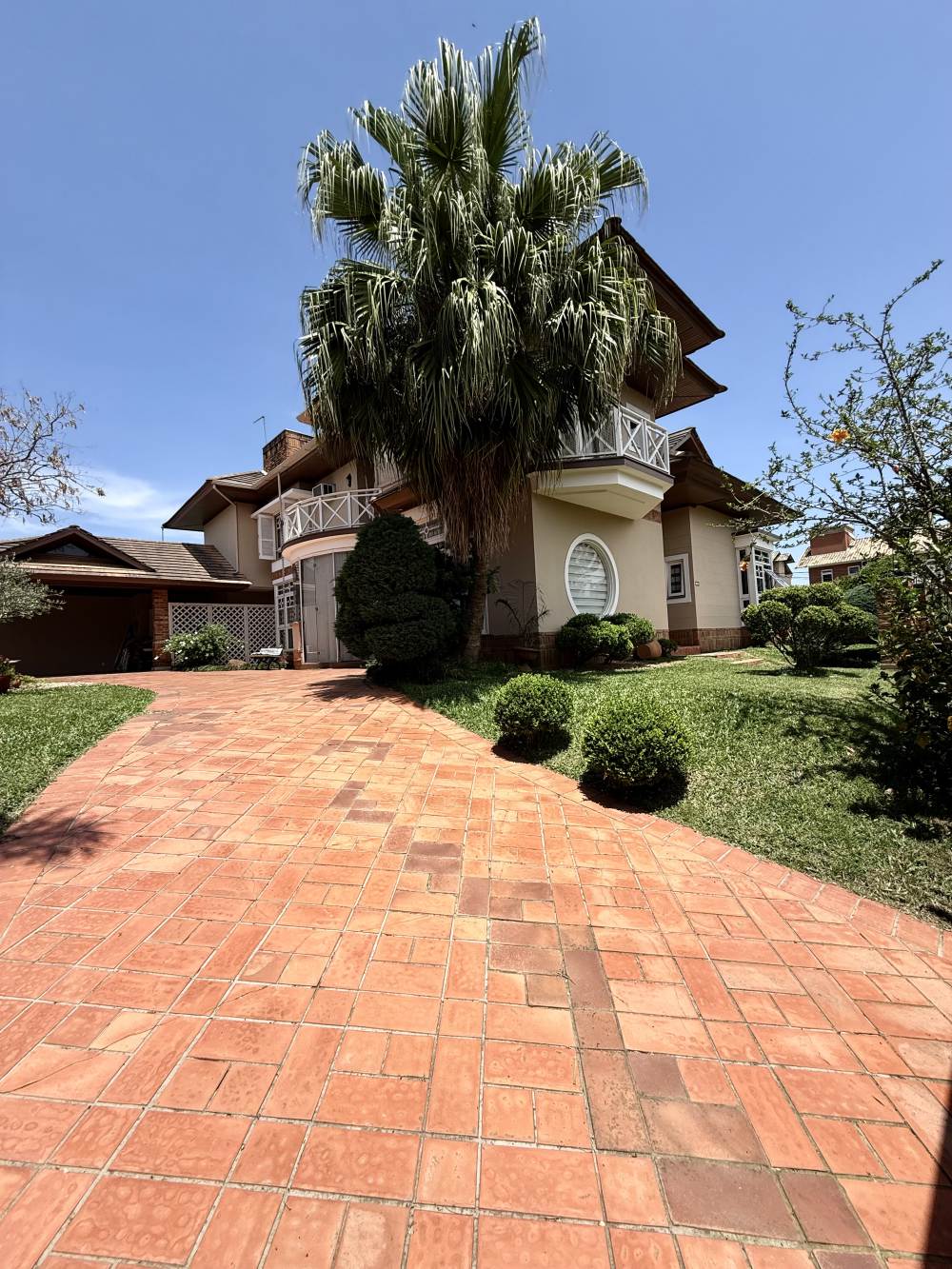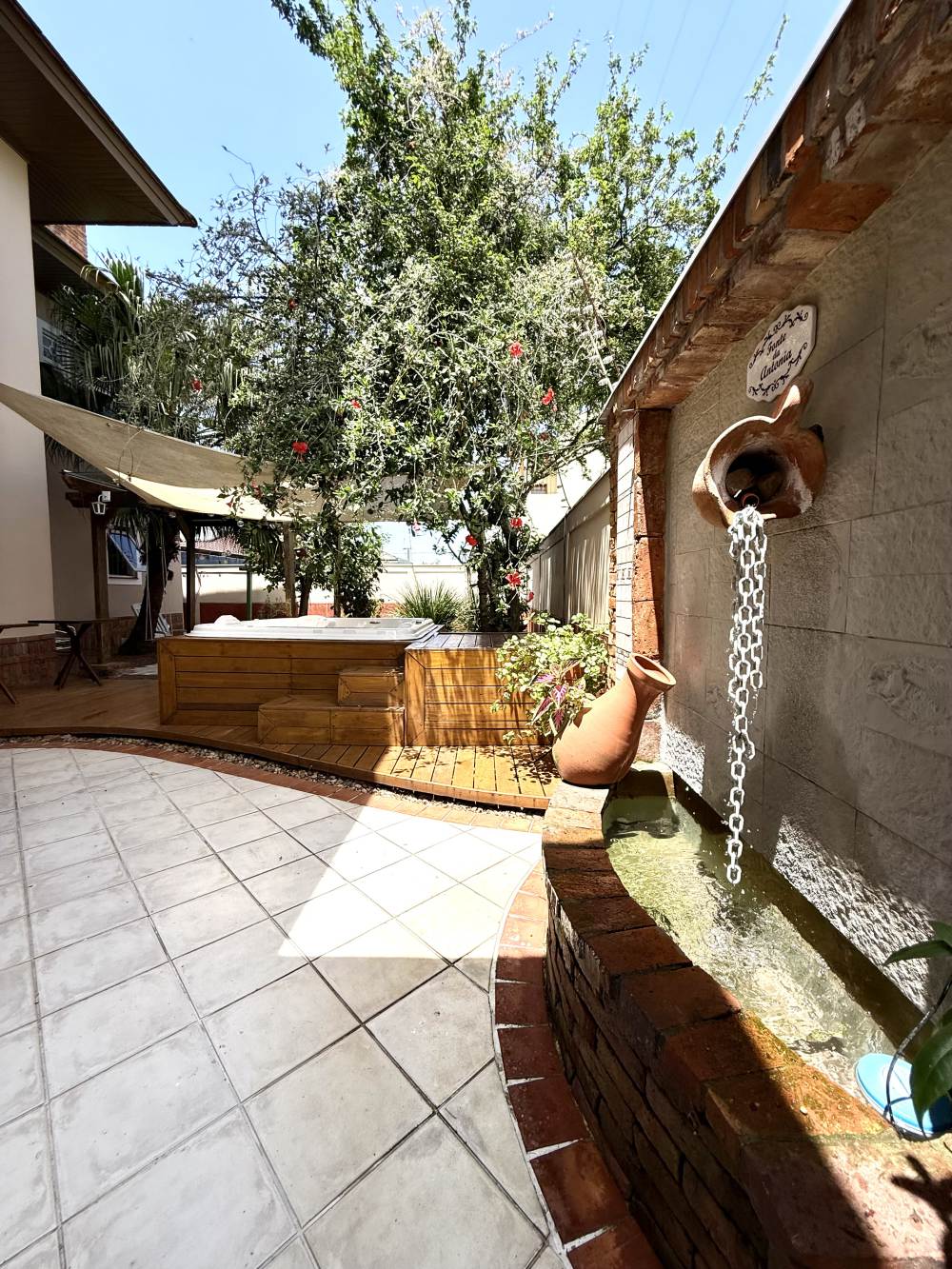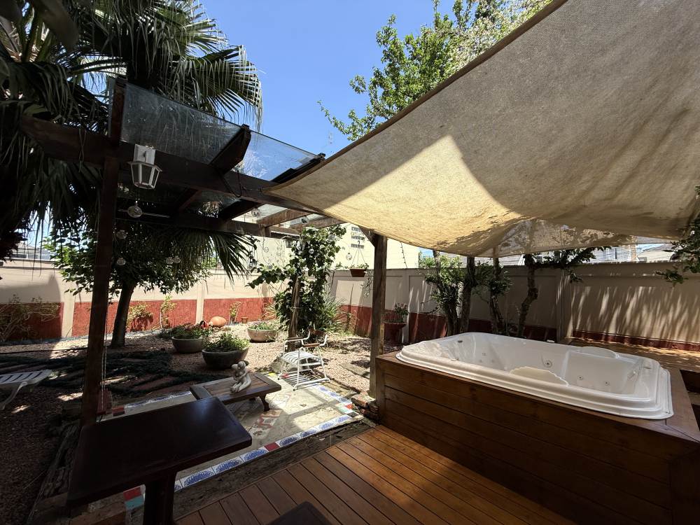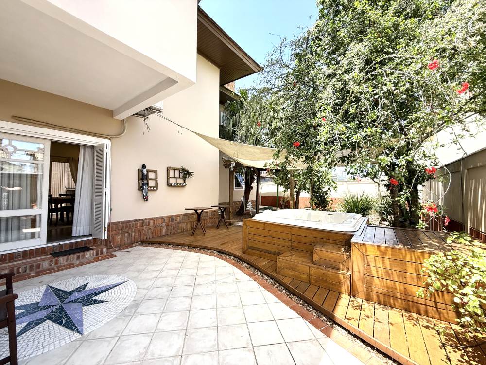 Construída no centro de dois terrenos, oferece duas áreas externas espetaculares: um jardim com árvores frutíferas, fonte e hidromassagem — verdadeiro clima de spa e outro lado integrado ao espaço gourmet com churrasqueira, forno de pizza e pergolado para momentos especiais. A garagem é ampla, comportando vários carros lado a lado, com aquela sensação de casa de novela.