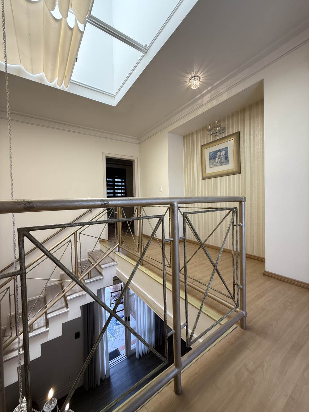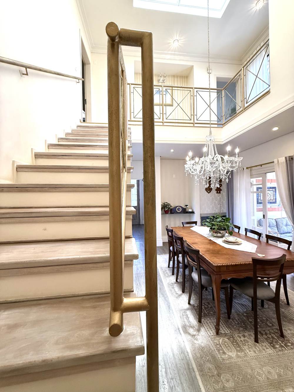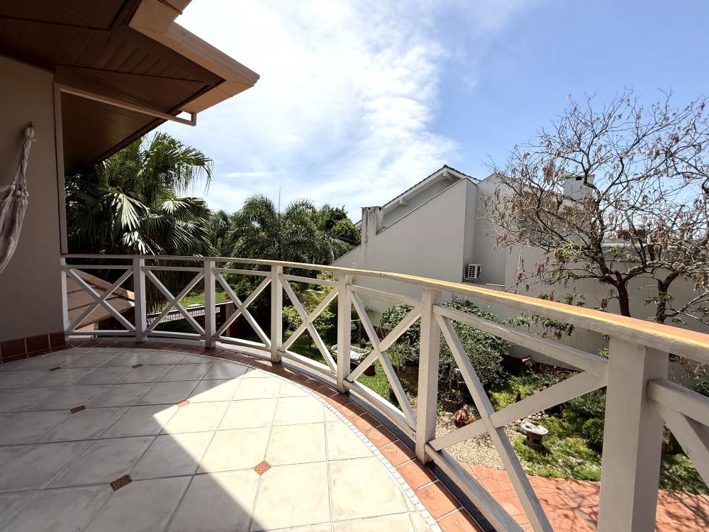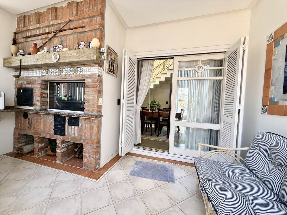 A casa conta com sala de TV aconchegante com lareira canadense, escada em madeira nobre, living com pé-direito duplo e uma sacada com vista privilegiada para o verde.
