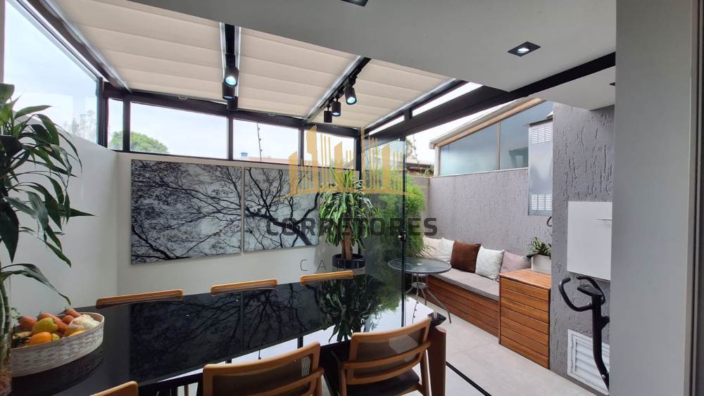 NO fundo temos um pergolado com vidro e cortinas de teto, com uma linda sala de jantar e um pequeno pátio com um banco idílico.